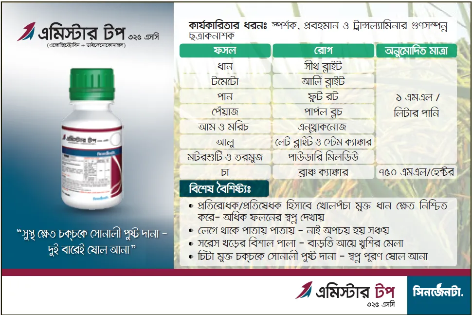 | অ্যাজোস্কিস্ট্রোবিন+ডাইফেনোকোনাজল | ধান | খোল পোড়া ও ব্লাস্ট | ৫০০মিলি / হেক্টর |